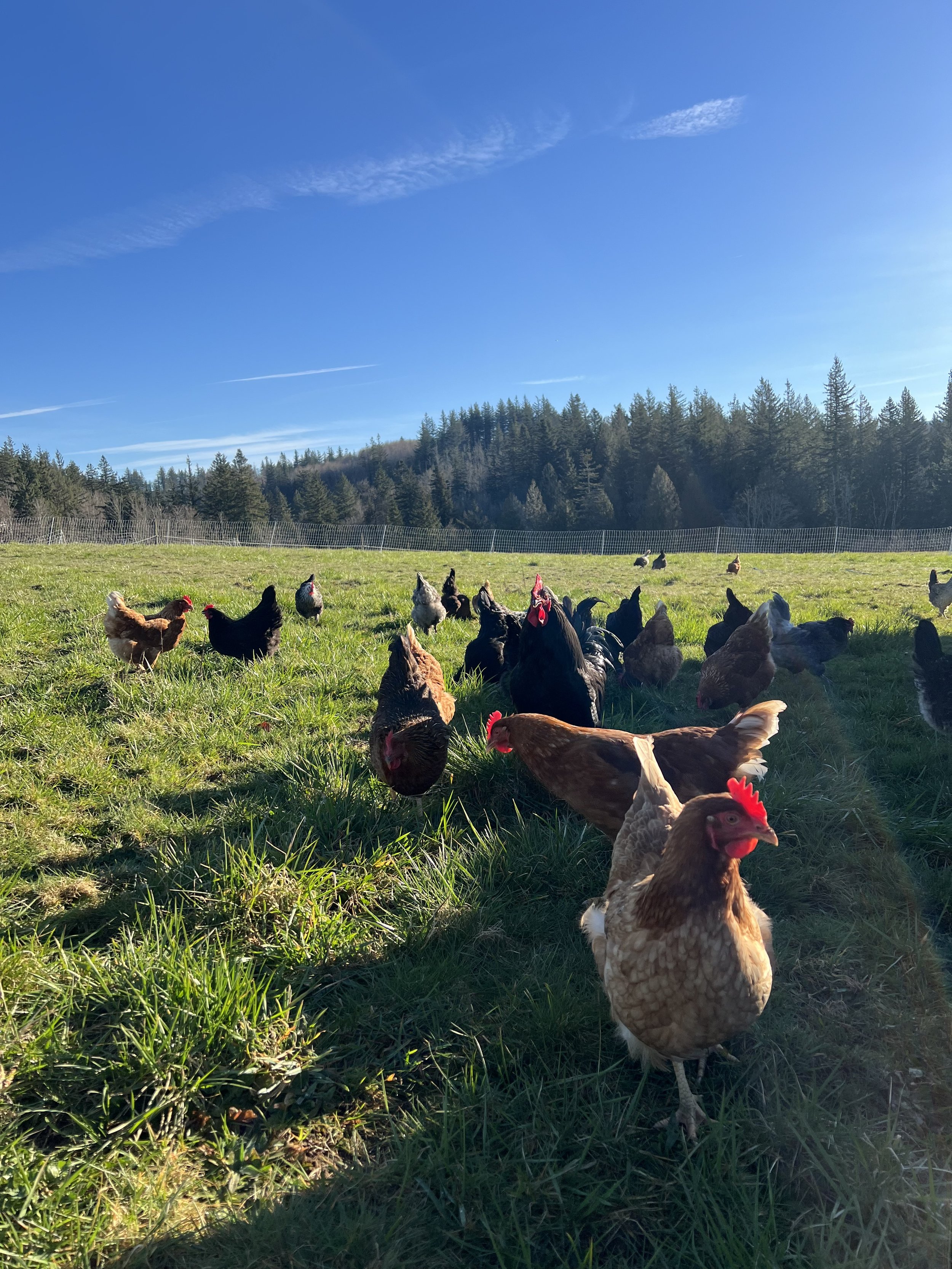 Our pasture-raised hens live on our 20-acre farm in Corbett, OR, where they’re moved onto fresh pasture daily. That means they enjoy all the bugs, worms, and grasses a hen could dream of, resulting in rich, flavorful eggs.